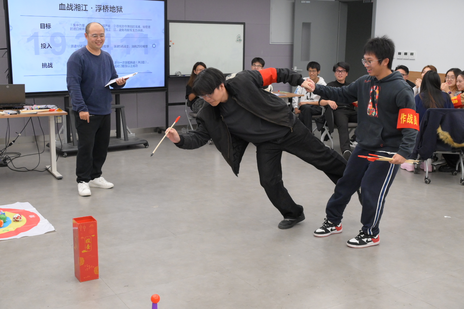 进入桌游展示与体验环节,教师党员李瑞琪首先将现场26名参与者分为五个小组,分发“图纸、战士、粮草、马匹”,并且详细介绍《长征途记》的游戏简介、游戏目标、核心概念以及游戏流程:参与者将分组扮演长征途中的红军小队指挥官、战士们,从江西出发,完整重走长征路。游戏进程中,不仅要突破敌人重重封锁、跨越雪山草地,直面恶劣自然环境与敌人围追堵截的双重考验,更需在关键节点做出一个个攸关生死的艰难抉择。更特别的是,游戏并无明确的“环节结束预告”,玩家无法提前知晓下一个挑战何时会迎来阶段性节点,就如同当年长征中的红军亲历者,在枪林弹雨与饥寒交迫中,难以预料这场远征何时能结束,只能凭借信念步步前行。这种未知性设计,让游戏不仅是一场空间转移的征程,更成为一次复刻红军“在迷茫中坚守”的精神远征。在策略协作完成任务的同时,玩家还需通过答题解锁长征历史知识点,通过套圈、投壶、积木等游戏得到奖励,从而让游戏体验与历史学习深度融合。